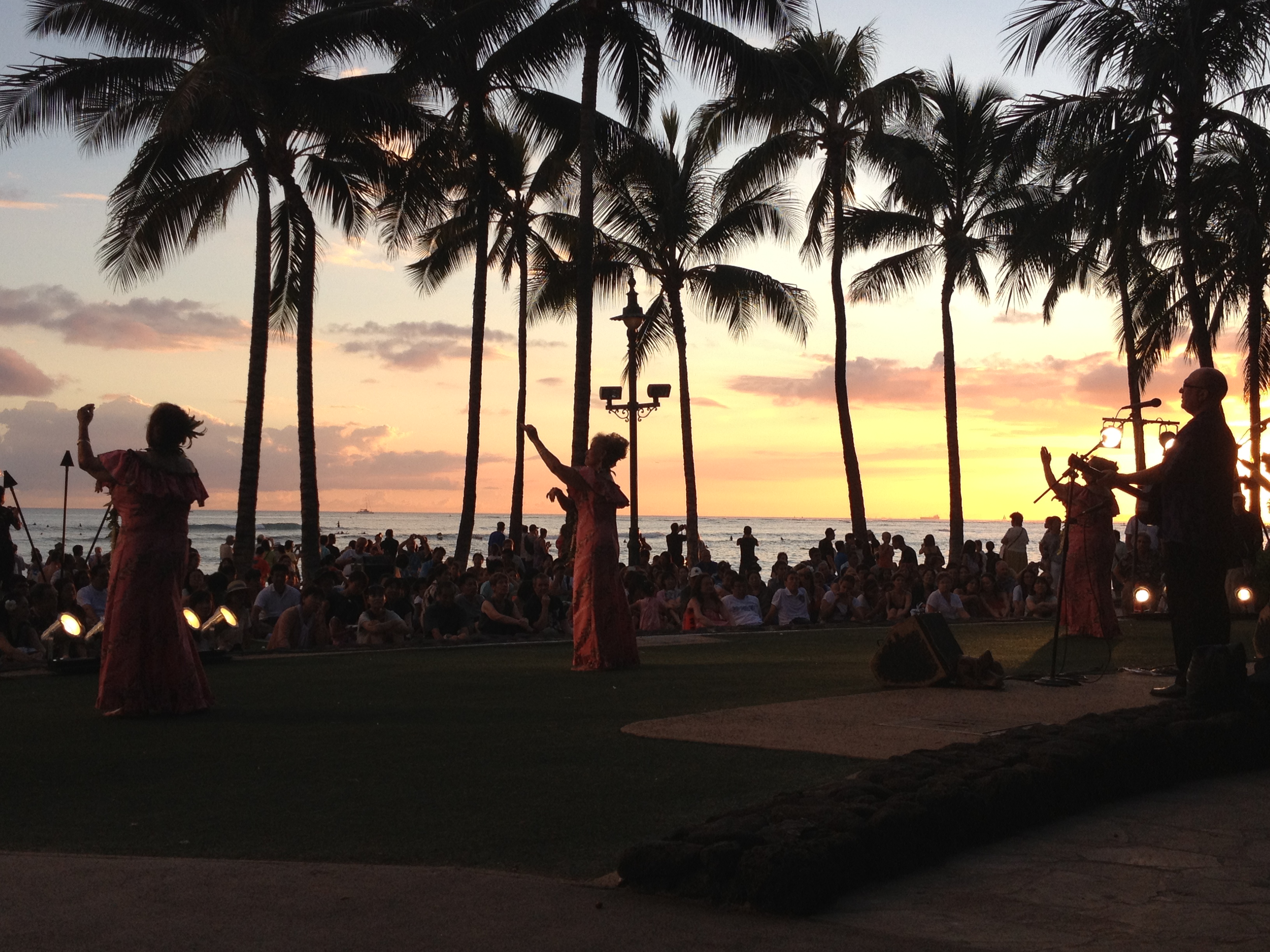 The Hyatt Regency, along Kalakaua Avenue in Waikiki, sponsors a free hula show every Tuesday, Thursday, Friday and Saturday (if the weather is good, which it nearly always is) at 6:30. The show lasts about an hour and features many different hula halau (schools) as well as other hula groups. The show happens just as the sun is setting on the ocean with live music and lots of seating on the grass for everyone to enjoy! It’s located right by the Duke Kahanamoku Statue on the beach. If you’re staying at any of the major Waikiki Hotels or Hostels it is just a short walk down the main stretch.