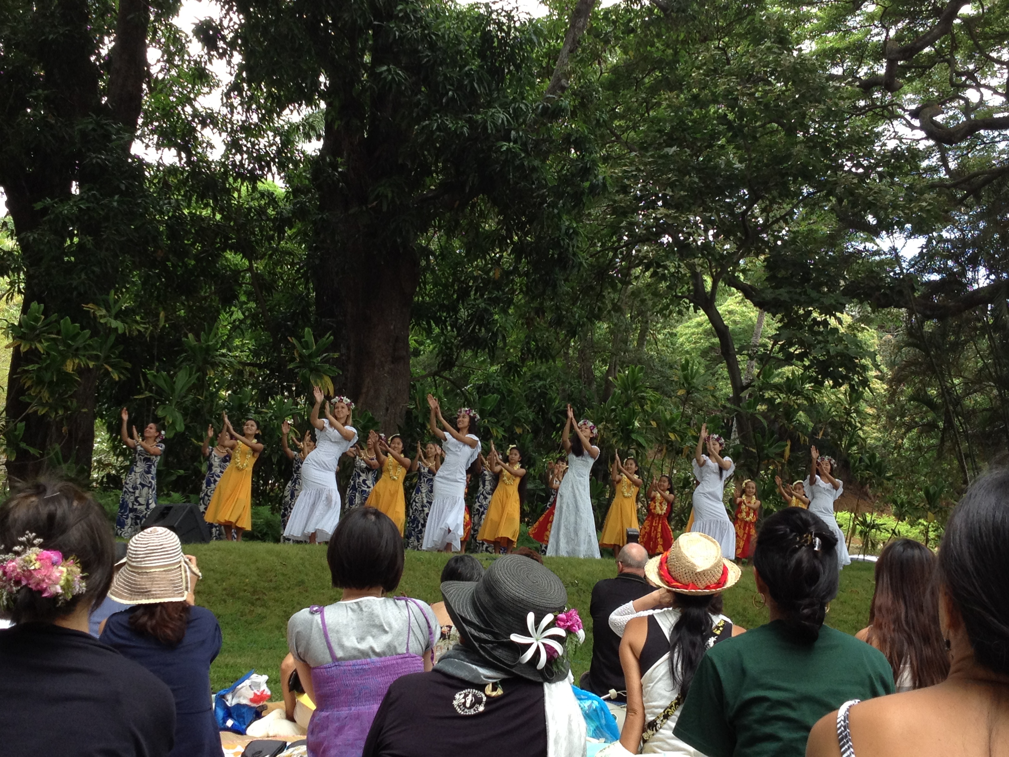 The hula mound is in front of a grassy area covered by a canopy of trees. It doesn’t get too hot, except right at noon when the sun peaks through. I arrived at 8:30AM in time to hear the Men’s Alumni Glee Club from Kamehameha Schools sing before the festival began. Definitely a unique experience is a beautiful forested area. I laid down a beach mat and wrap on top of it and plopped down in the center of the area to watch the performances. The only downside to the day was being bitten by a big black ant! It latched onto my forehead for a minute and I pulled it off. I didn’t see any for the rest of the afternoon, so maybe it was just a freak occurrence, but keep your eyes peeled!