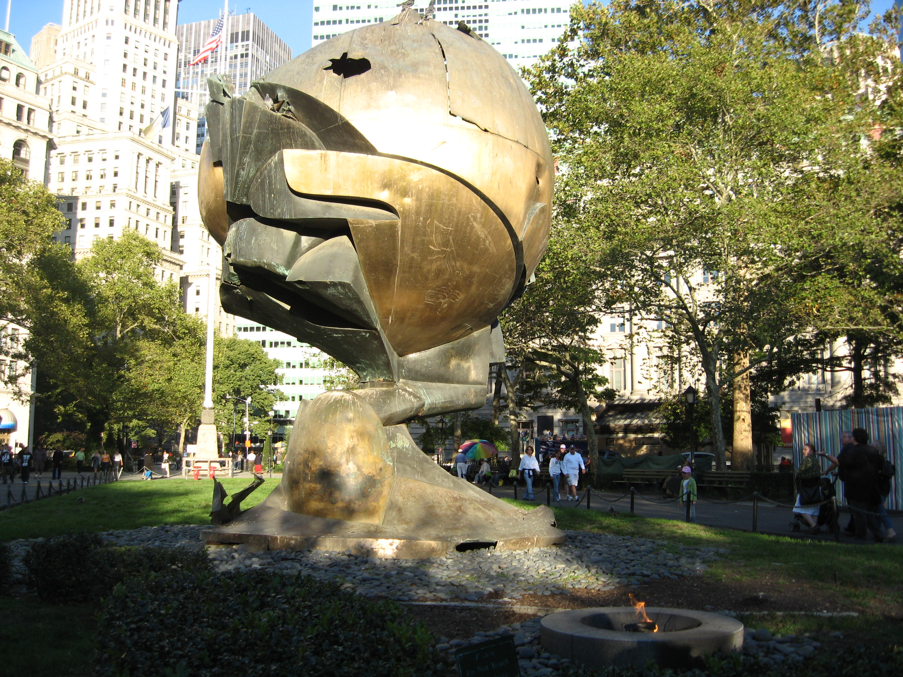 We spent the afternoon at the park on a Girl Scout trip a couple of years ago. Got ice cream. Did some people watching. Took lots of pictures. One of my favorite sights in the park was “The Sphere,” a sculpture by Fritz Koenig. This sculpture once stood between the Twin Towers in NYC, until September 11, 2001 when the buildings were destroyed in a terrorist attack. This sculpture, somewhat miraculously, survived with minor damage. Today it stands in the park, marked by a flame. It has become a bit of a tourist attraction, but it’s still an important site to see and the park itself is not too crowded.