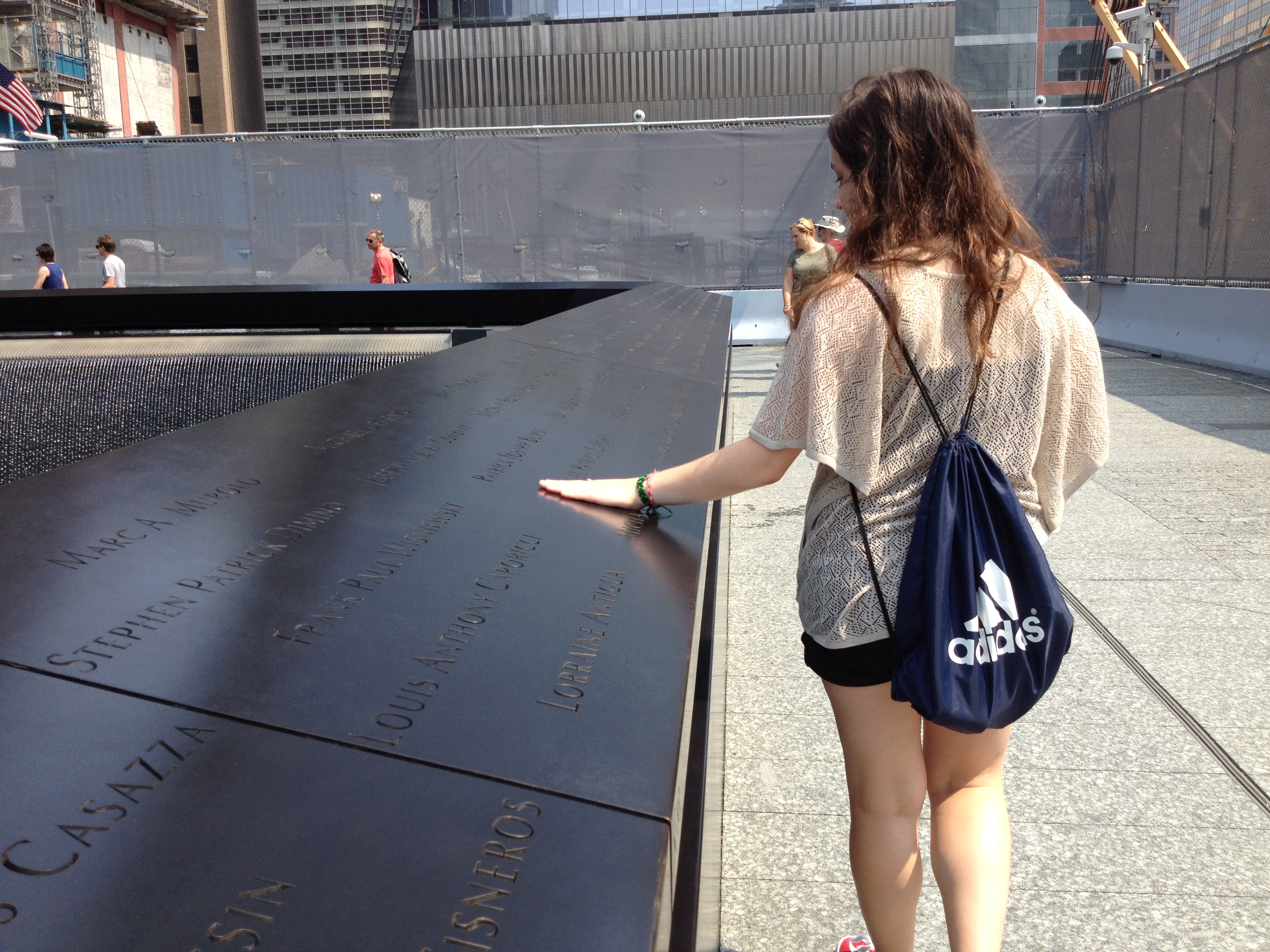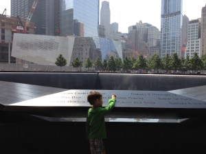 The memorial is very well done. There are two massive inverted fountains in the footprints of the two towers. You can walk around the edges running your hand along the names of the many people who died on September 11, 2001. I saw several people doing that today (I’m pictured above). One woman and her father stopped when they found a name they clearly recognized and set at a rubbing on a piece of paper they had brought along. At the other tower memorial a little boy in a green shirt traced the letters of the names he passed. It’s really profound to see everyone’s personal experience with this place.