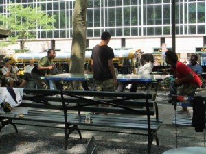 Unambitious. The city never sleeps. It’s as if New Yorkers were a particularly feisty breed of urban sharks and that some part of them, feet, hands or mouths, need to be perpetually in motion else they’d drown in a sea of tranquility. I’ve come to the conclusion that the city is divided into two types of people, people in a hurry to get somewhere and out-of-towners. BP is different. Here you have a block worth of quiet where you can see regular New Yorkers – day traders, artists, students, clerks and the like, doing the least New York of all activities, nothing.