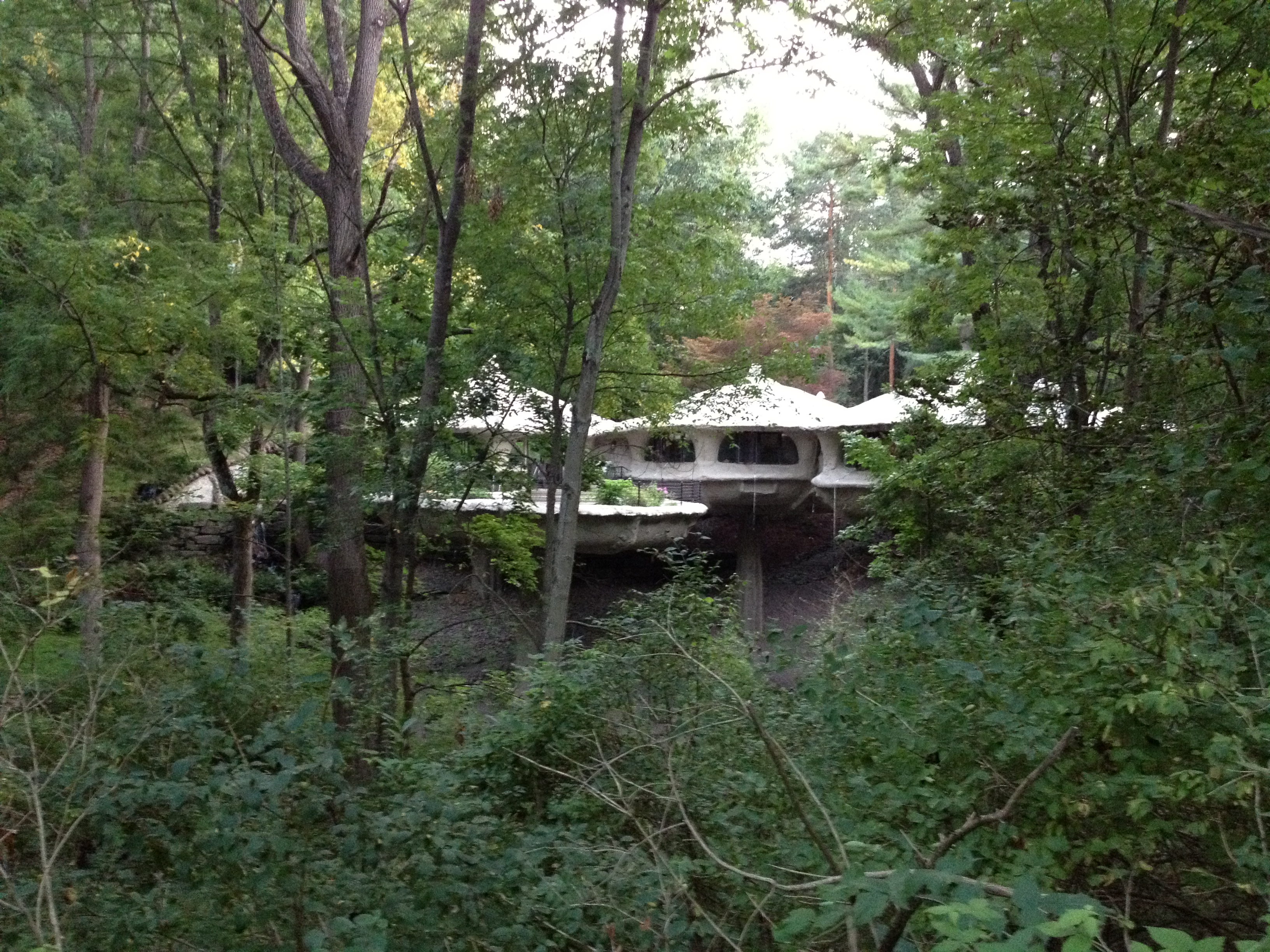 The house is incredible. I’m led to believe it wasn’t intended to look like a group of mushrooms, but it certainly does. It’s fantastical and beautiful. The rooms seem to be suspended above the woods because each mushroom is held up by something that looks like a plant stem.