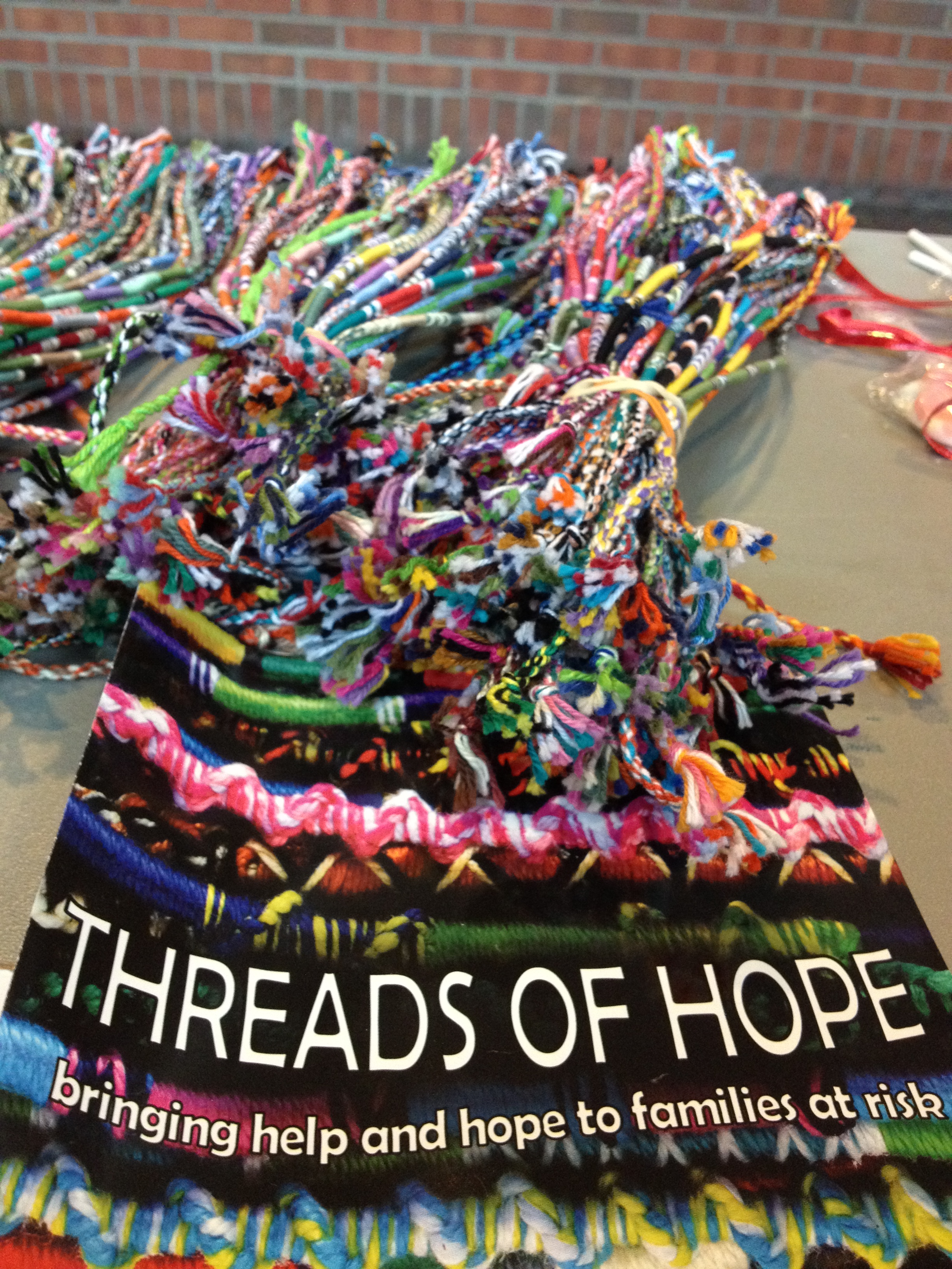 Today for Kappa Phi (a Christian women’s group I’m involved with on campus) we sold “Threads of Hope” bracelets in the Student Center. Impoverished women and children in the Phillipines make these bracelets and charity groups in the US can buy them to sell for $– sending the profits back to the families that made them.