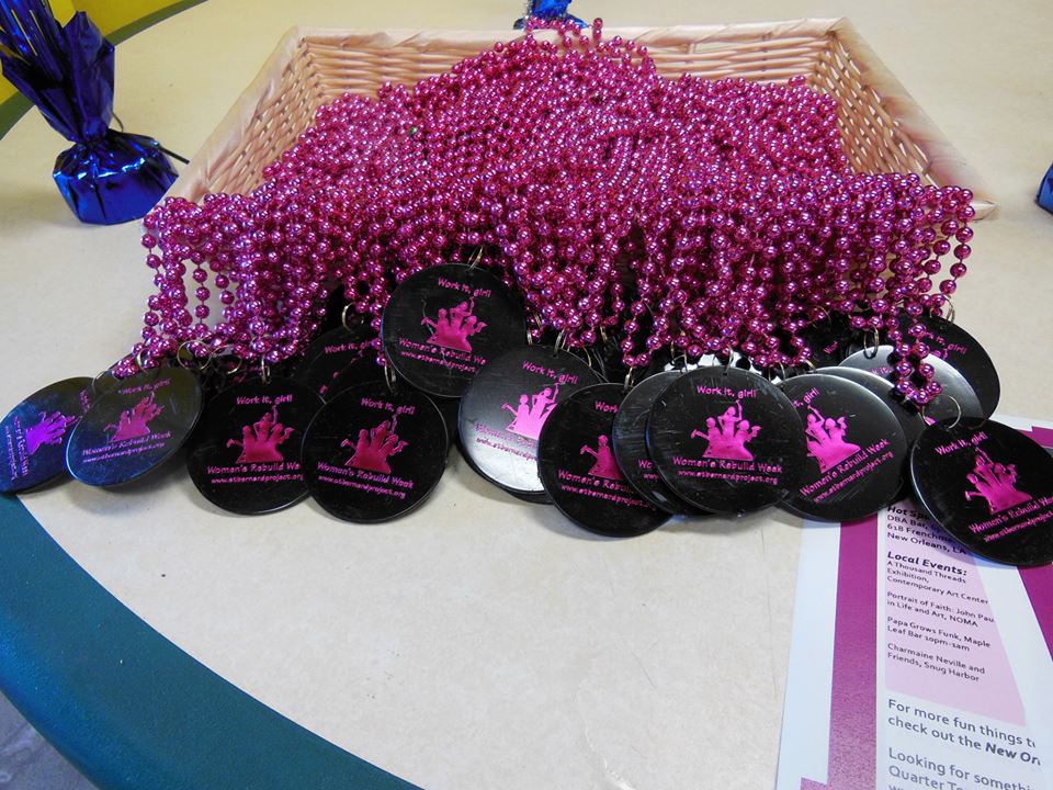 On Monday we headed out at 7:45 and gathered at the St. Bernard Project home-base for a brief orientation before driving over to our work site. We were given the ever-famous New Orleans Mardi Gras beads with a “Women’s Week” medallion attached and took our seats on the wooden benches.