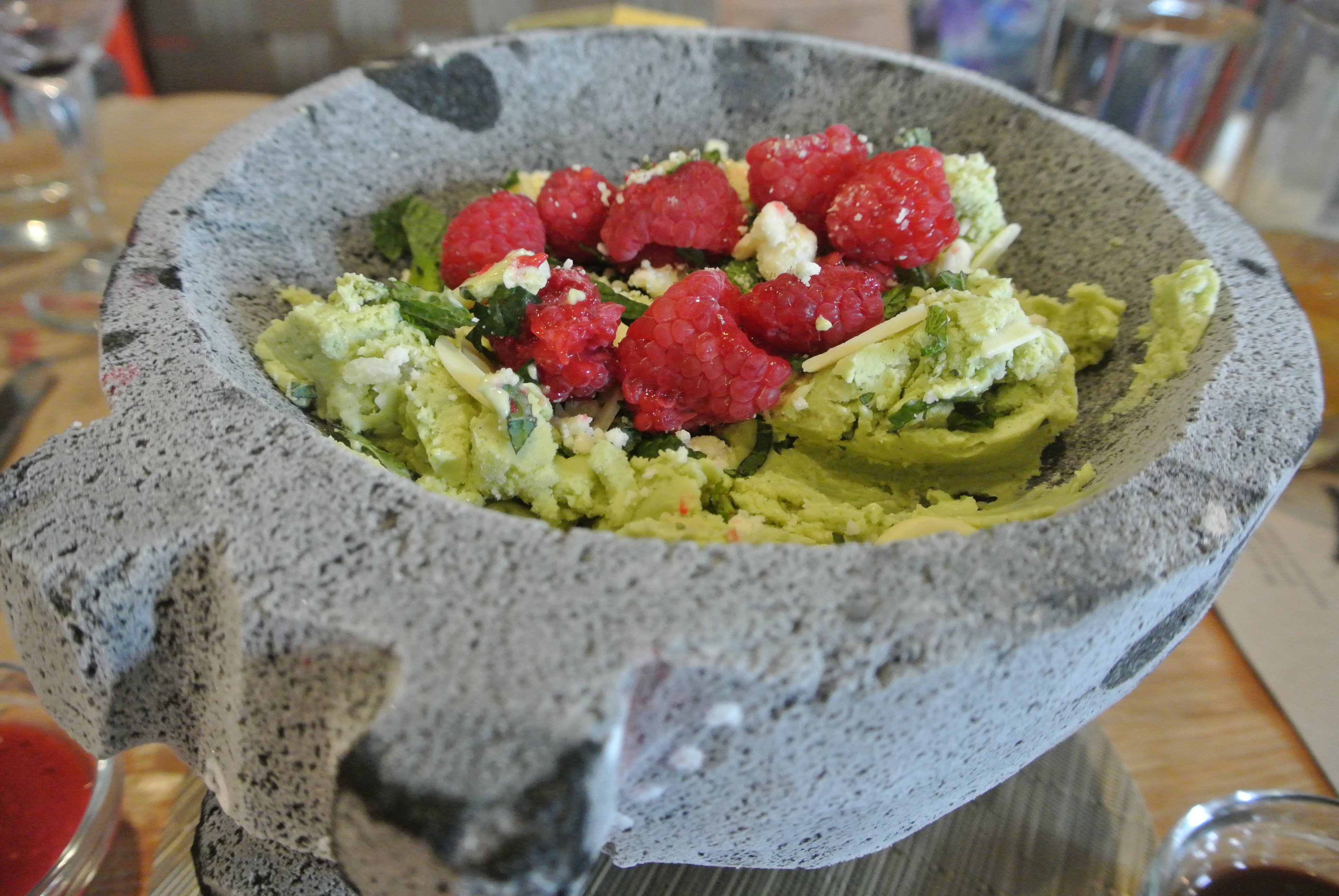 In goes the sweet avocado ice cream as the waitress stirs the mixture with wooden spoons, then the white chocolate shavings and coconut crunch, and finally mint leaves and raspberries. On the side, she places a sweet fruit topping and a dish of chocolate to drizzle on top. The gluten-full version comes with a cinnamon sugar Buenuelos and the gluten-free version comes with cinnamon sugar corn chips.
